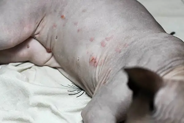 Egyes macskák erős allergiás reakciókkal bírnak a környezeti irritánsokra vagy a rovarcsípésekre. Az alábbiakban egy fotó található, amely allergiás reakciót mutat a kitöréssel és a gonoszsággal a Szfinxben: